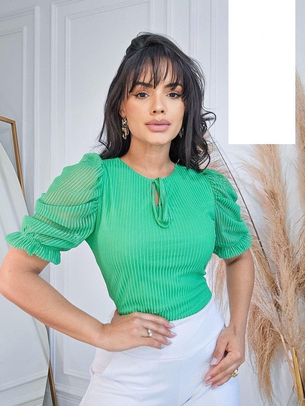 Hermosa blusa importada de tul forrado en su interior. Elastico en las mangas y detalle de lazo en el cuello.
