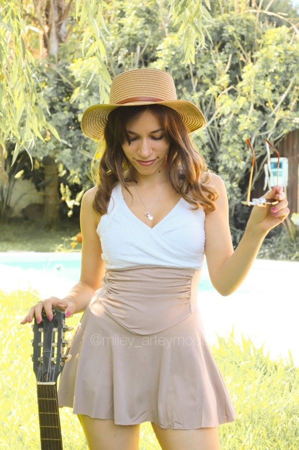 Hermosa malla modesta con almohadillas desmontable en la parte del busto, y tiras (regulables) cruzadas en la espalda. Fruncido en el frente y short debajo de la falda.