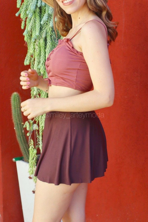 Hermosa malla modesta de lycra de tres partes: top, short y pollera (por separado). Con almohadillas desmontables y tiras regulables. Detalle de tiritas tipo corset y volados en el frente.