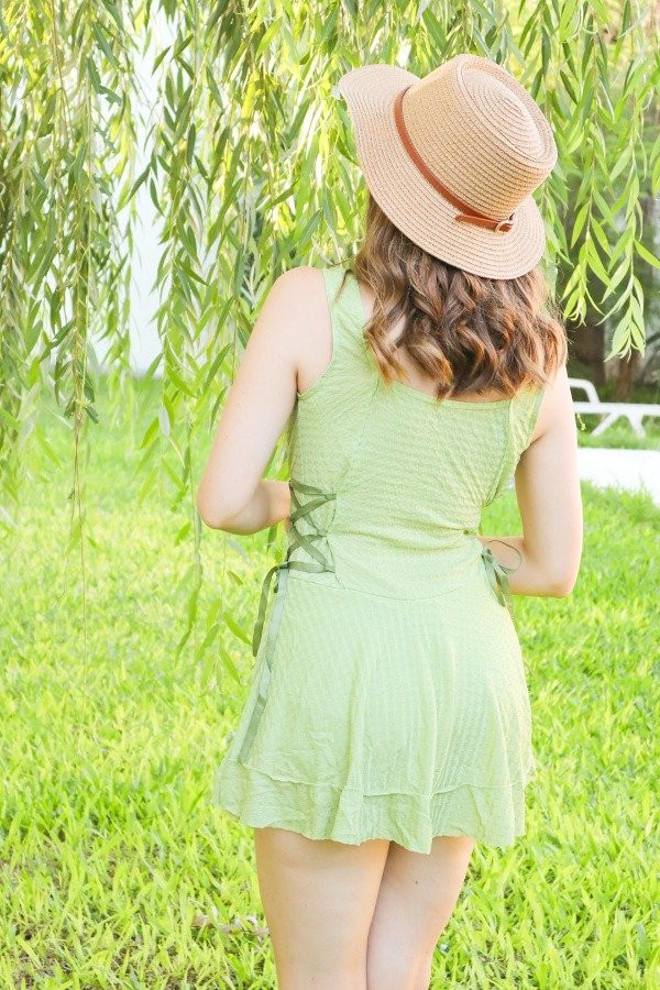 Hermosa malla modesta con almohadillas desmontable en la parte del busto. Detalle de tiritas regulables tipo corset en los costados y short debajo de la falda.