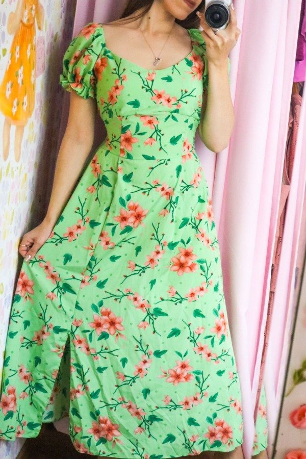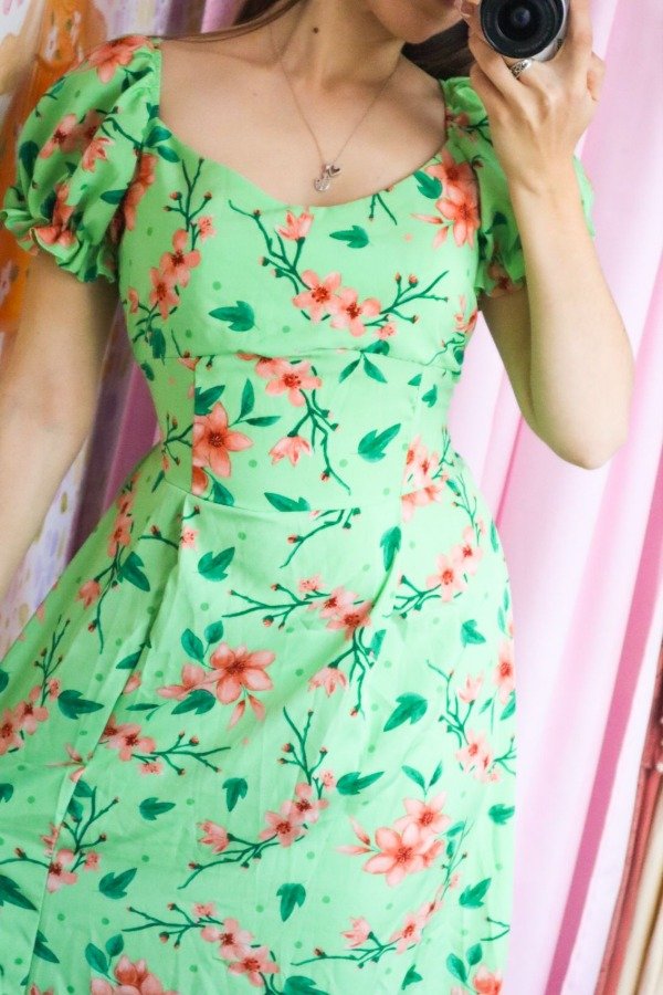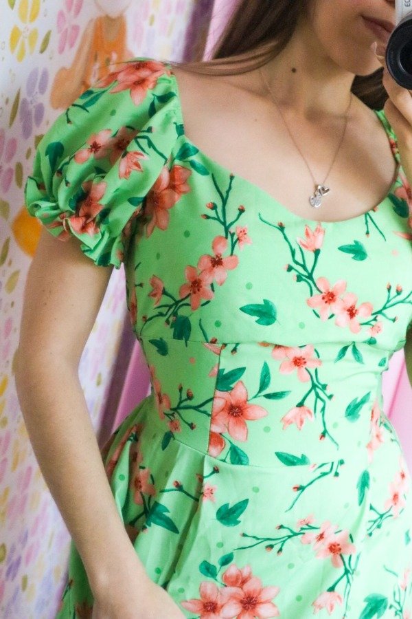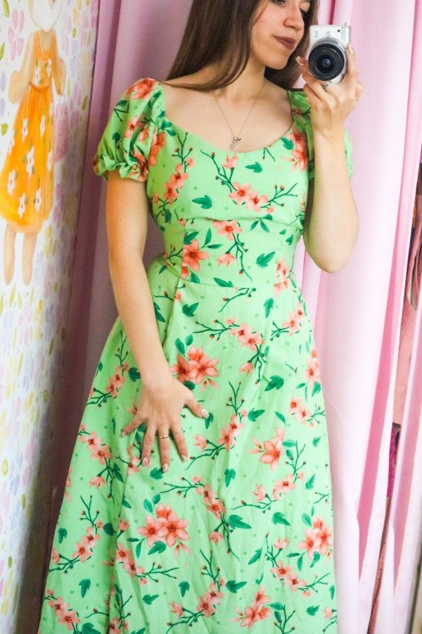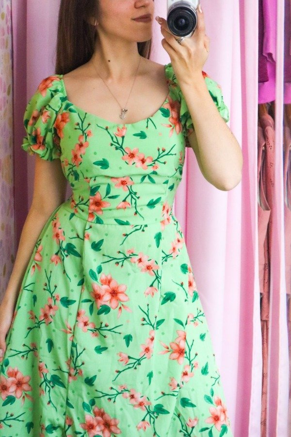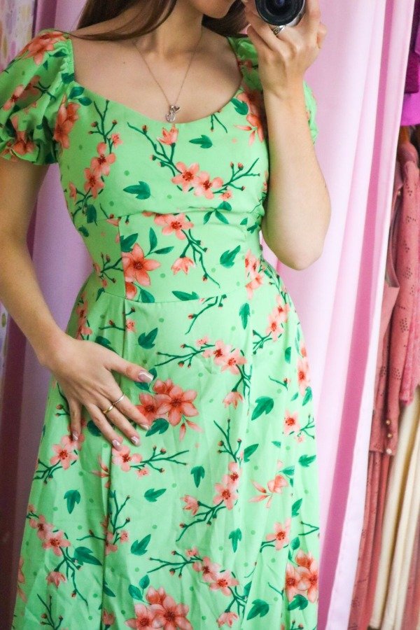 Hermoso vestido importado de crepinho con elástico en la cintura, mangas y espalda. Escote corazón, manga princesa y frunce en el frente.