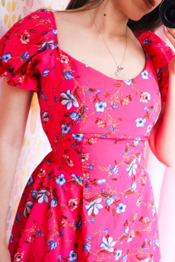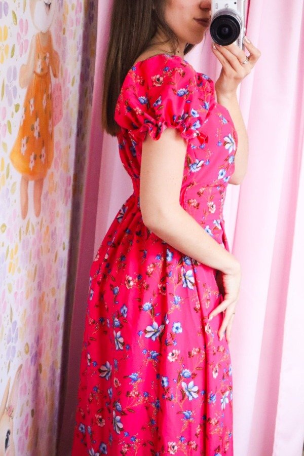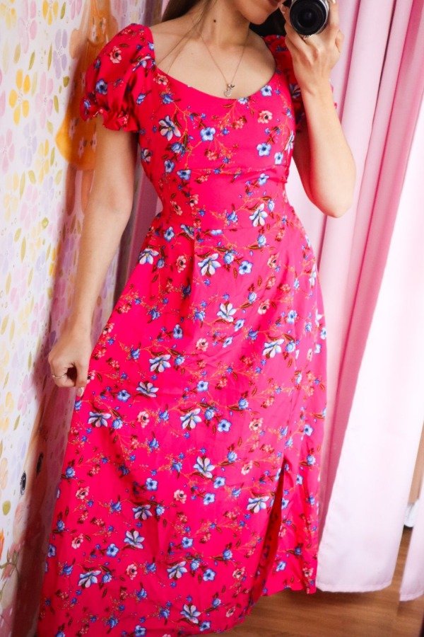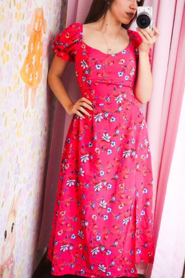 Hermoso vestido importado de crepinho con elástico en la cintura, mangas y espalda. Escote corazón, manga princesa y frunce en el frente.