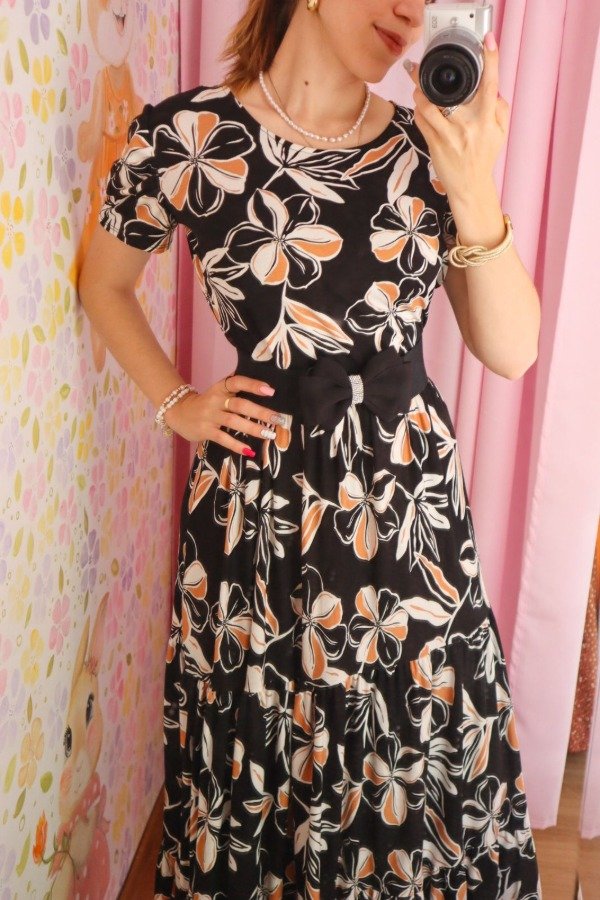 Hermoso maxivestido de modal con crep. Cuello redondo y detalle de recortes con volados en la falda.